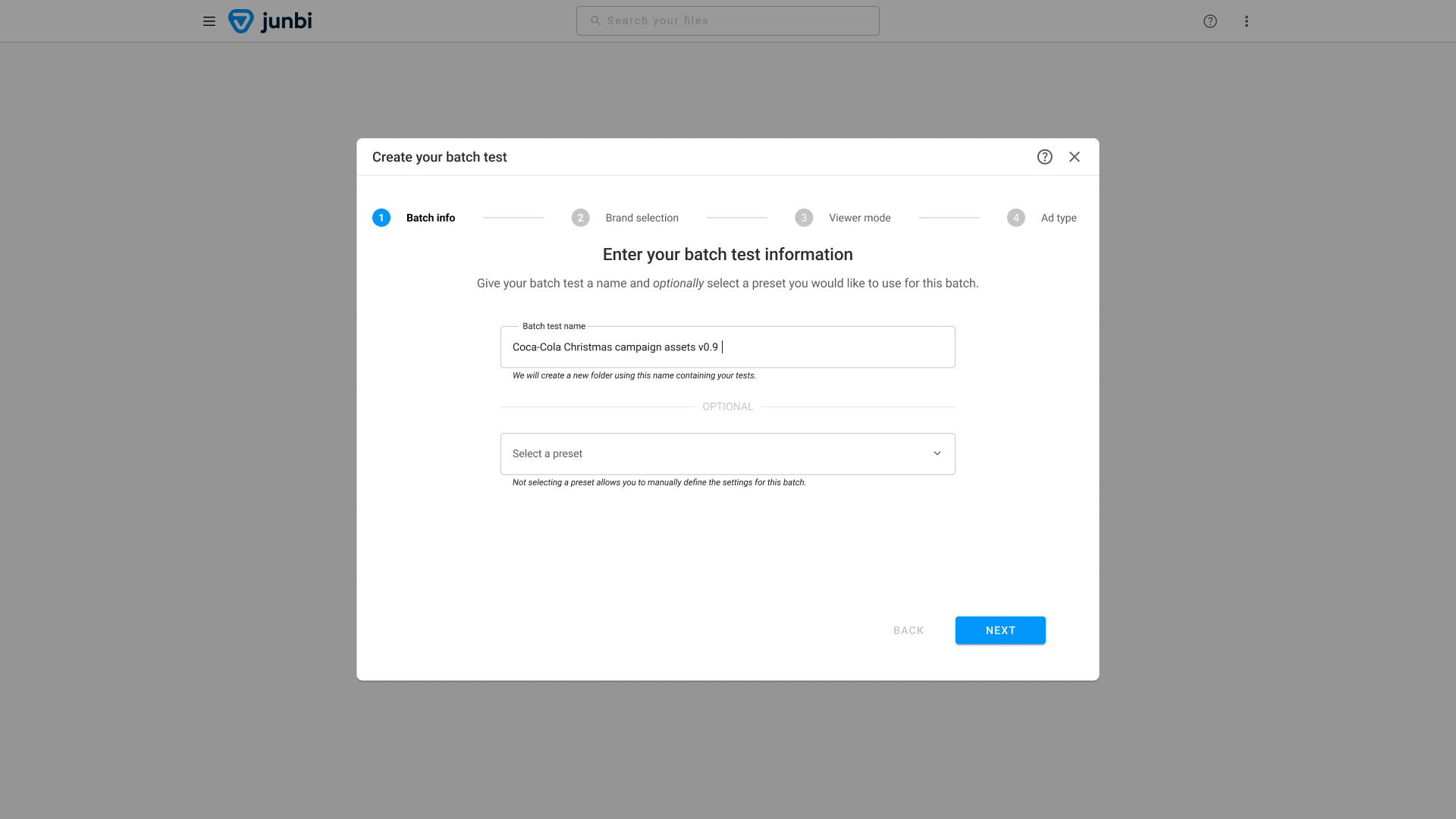 Time to name your batch! Important, because your batch name will represent the folder we will create for you, where your assets as part of this batch will end up when your analysis is done. In addition, you can select your desired preset here to avoid all of the next steps and head straight to uploading your assets.