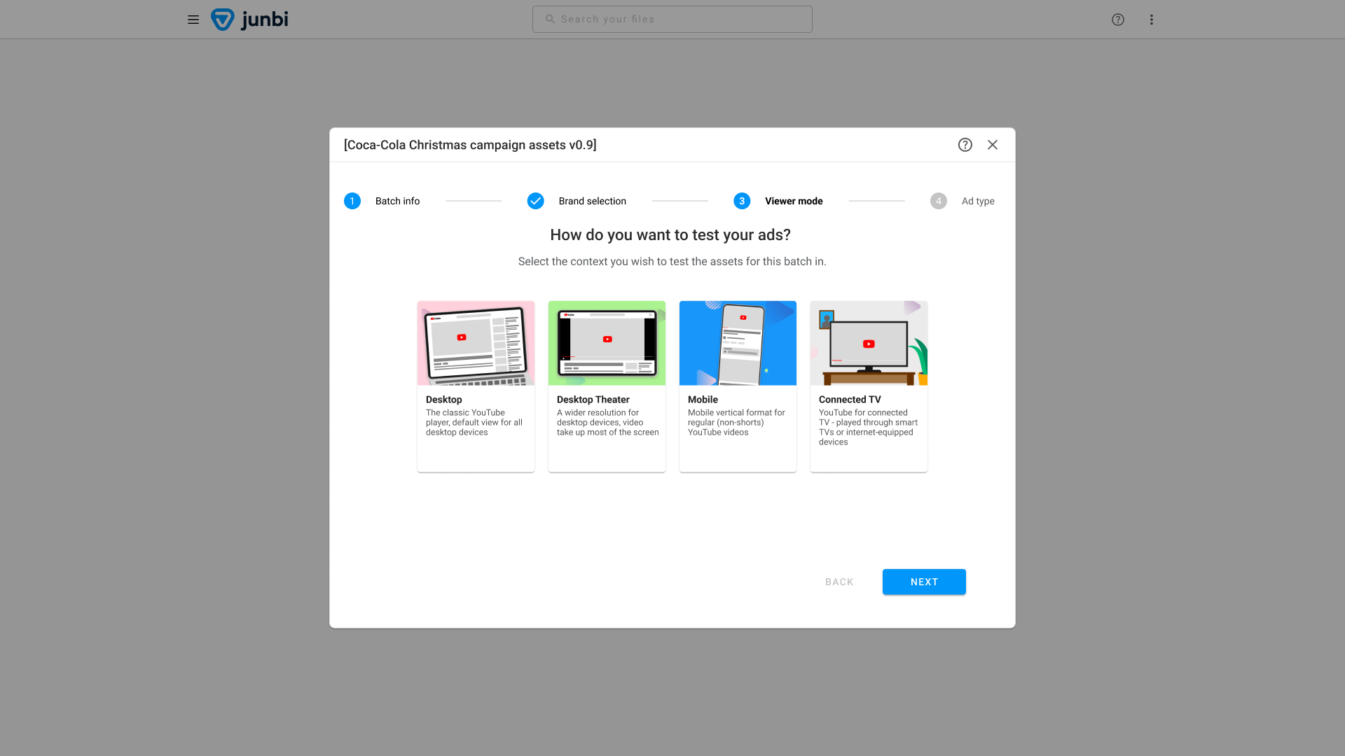Next, you must select the ad type you wish to test for. On YouTube, different ad types are obviously watched in different ways and need to be scored differently to predict effectiveness. To learn more about YouTube video ad types, you can take a look at this YouTube help article. Once you've selected your ad type, click next.