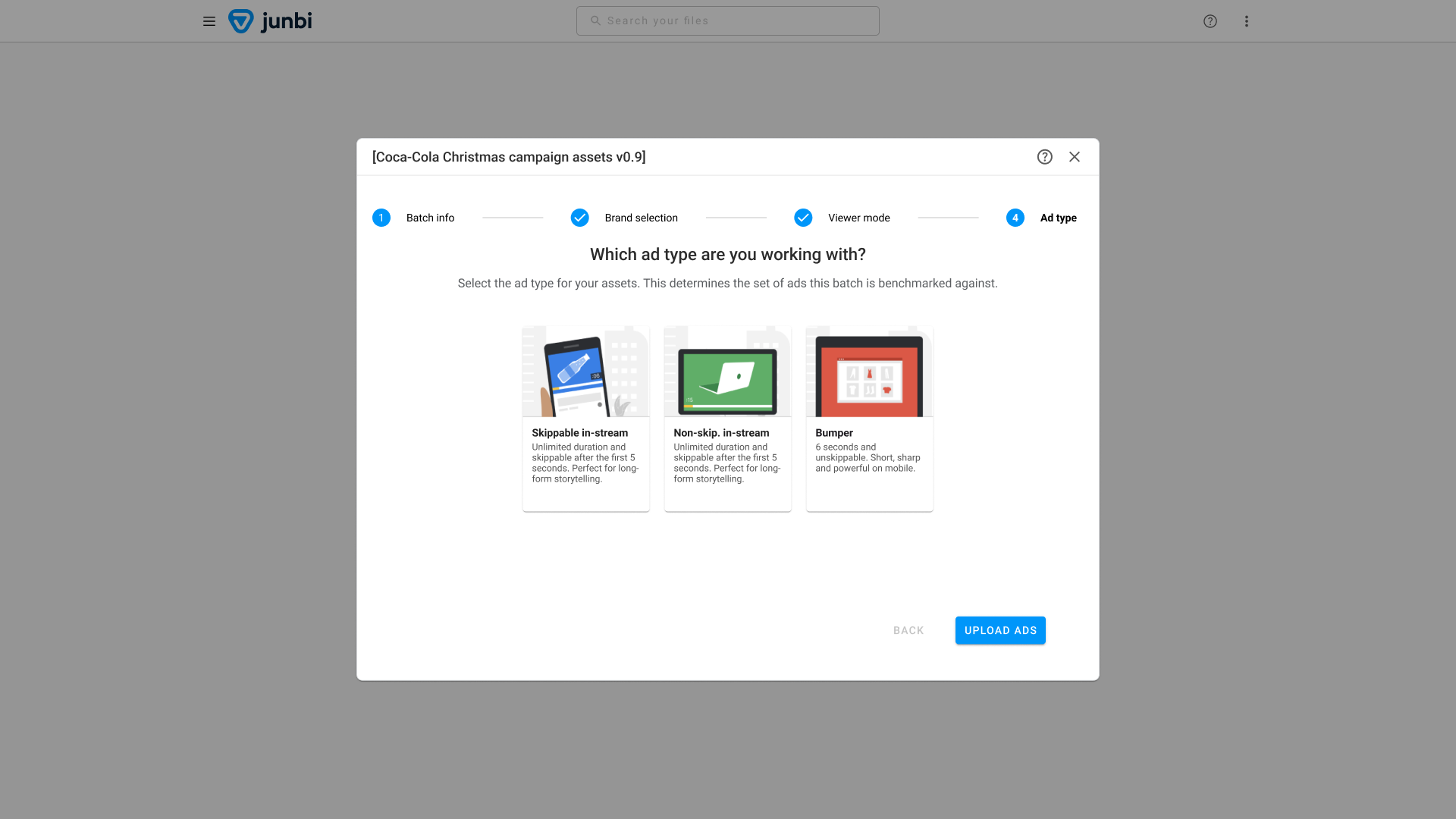 Now it's time to upload the assets for your batch. You can upload as many assets as you'd like. Remember that the selected ad type influences how long your videos can be, as we only allow videos up to 6 seconds for bumper ad tests.