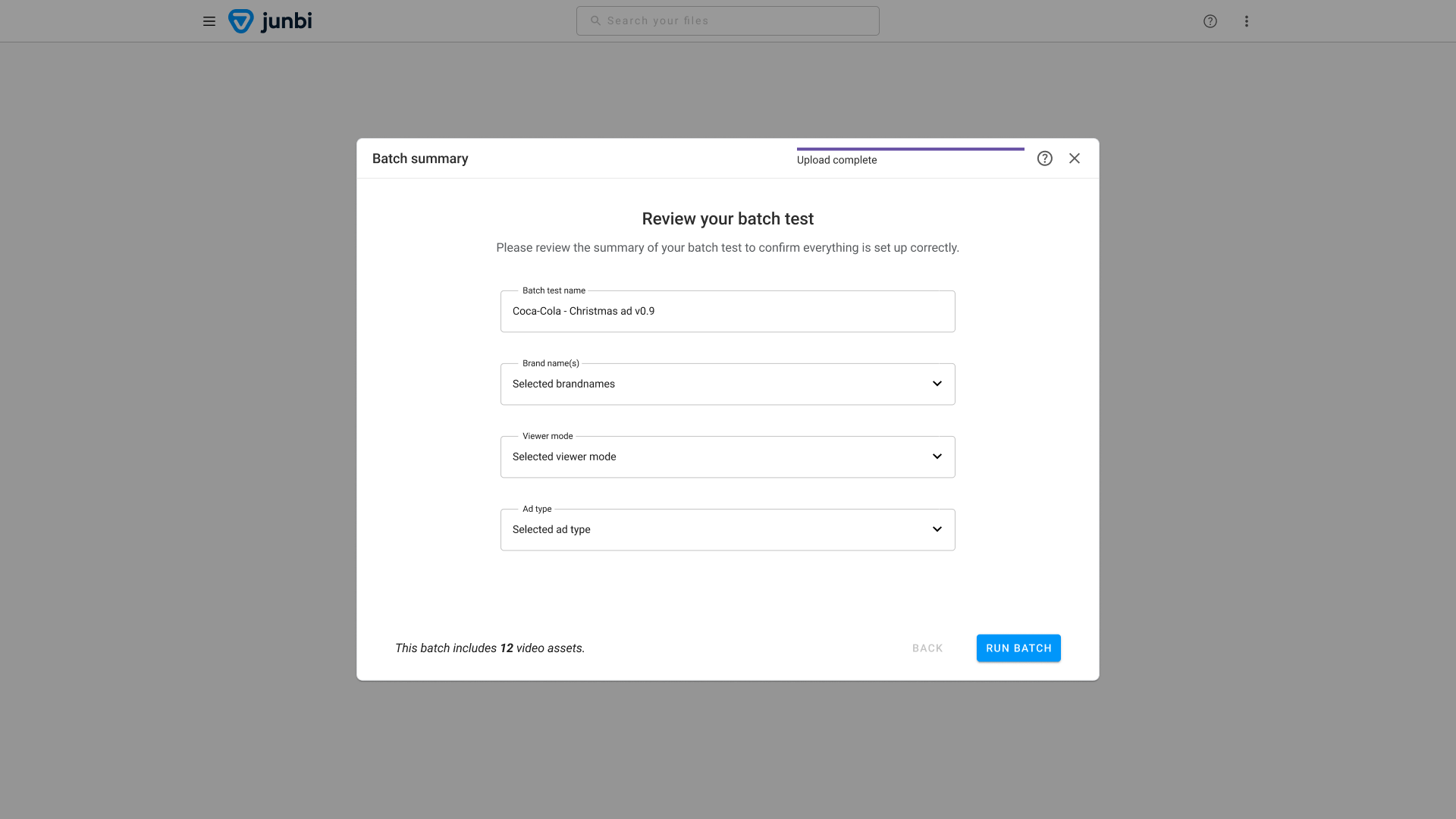 Finally, we want to make sure everything is in order, so we want you to take one final look at all of the settings you've set for this specific batch. To ensure you are also able to see if you've uploaded all the assets you wanted to test, you can find the number of assets as part of this batch in the bottom left of your screen. Adjust settings when and if needed, and if all looks good, hit the run batch button!